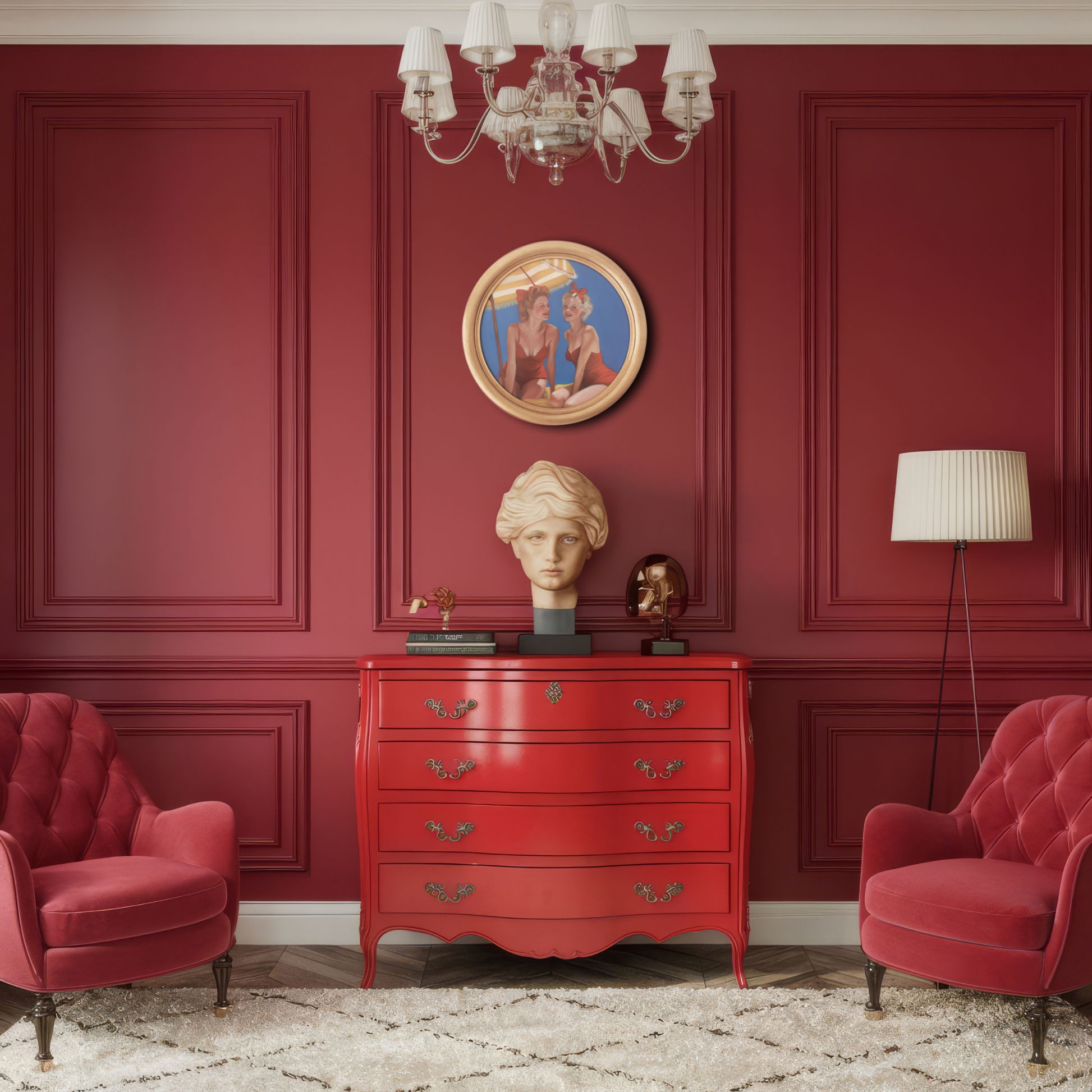 Amalfi celebrates friendship, sunshine, and timeless style. Set against an azure blue backdrop, this circular-format oil painting features two women in bright red bathing suits beneath a yellow-and-white striped parasol. With a vintage 1950s pin-up aura and contemporary colour palette, Amalfi evokes the warmth of Mediterranean summers and the joy of shared moments.