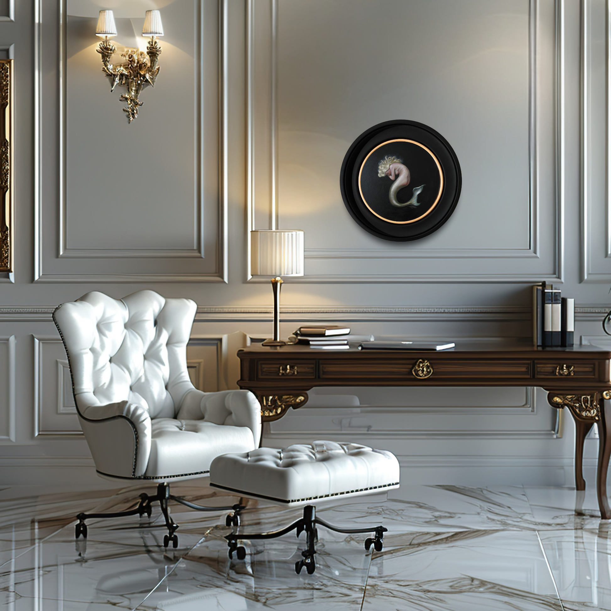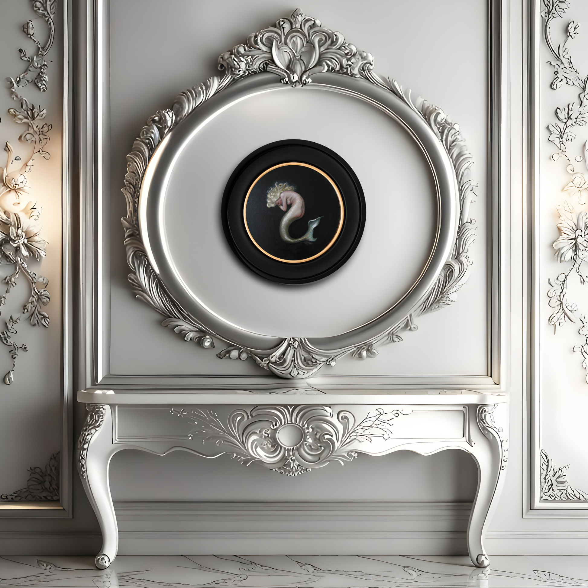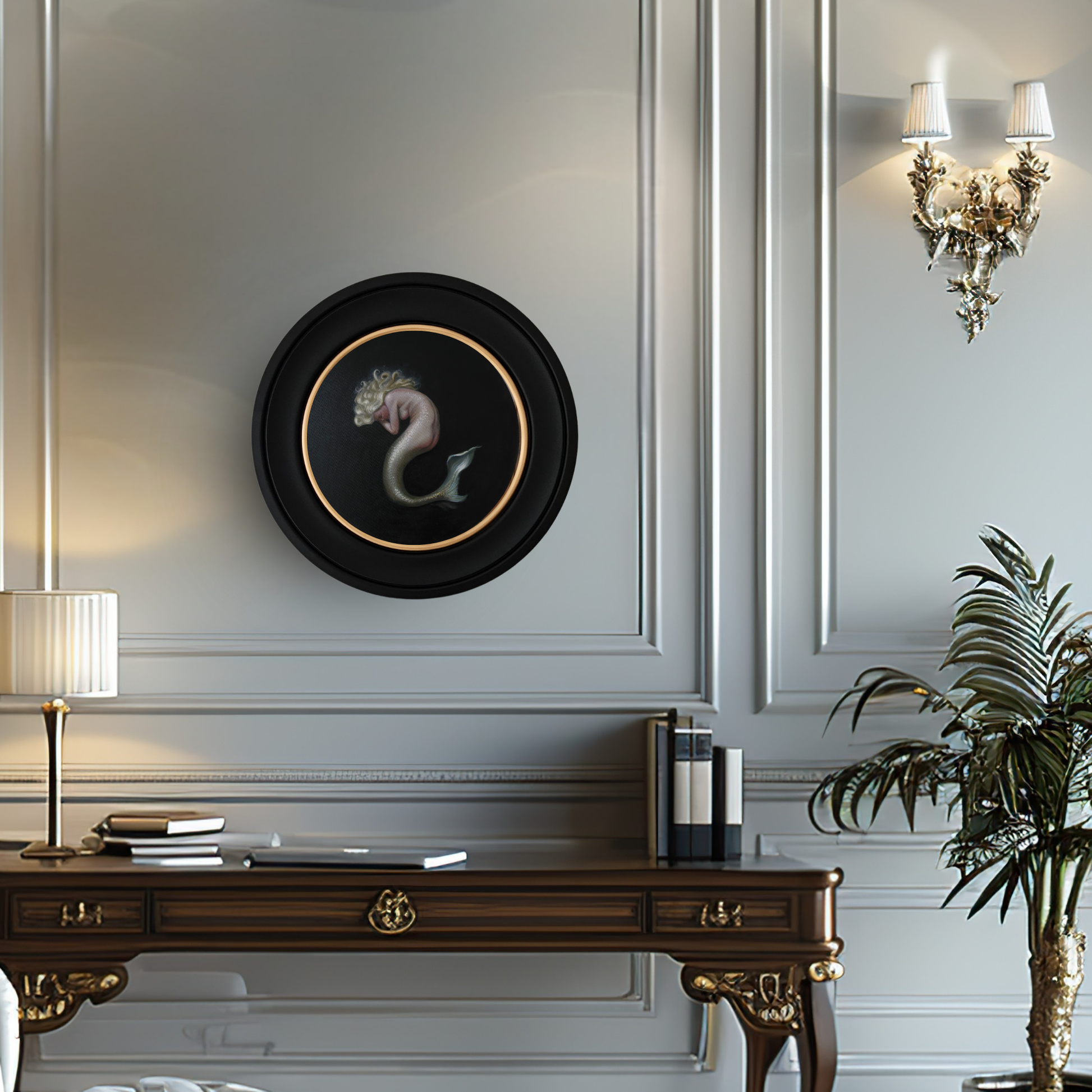 A circular original oil painting of a fair‑haired mermaid, shown resting in peaceful sleep against a deep, dark background. Her scales are rendered with classical glazing on fine‑grain linen, giving the artwork a soft, luminous presence. This piece has a quiet, intimate atmosphere, ideal for collectors of fantasy art, mythical creatures, and contemporary figurative realism.