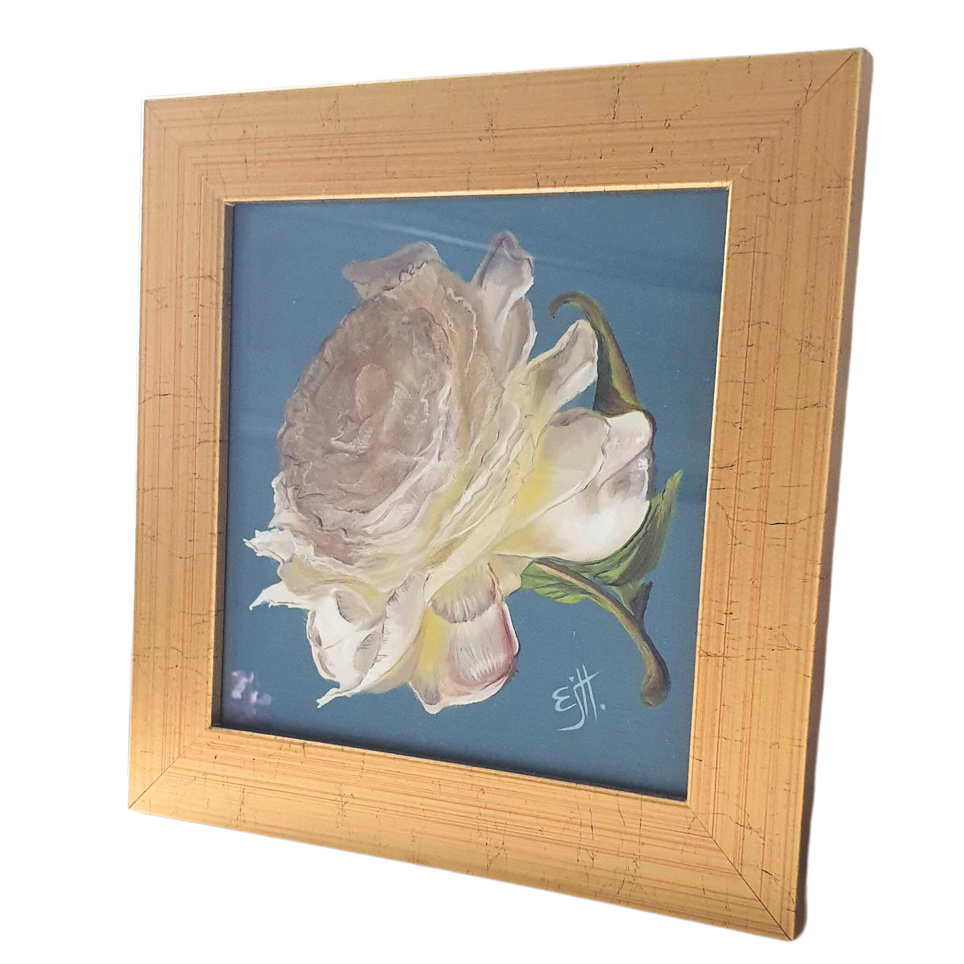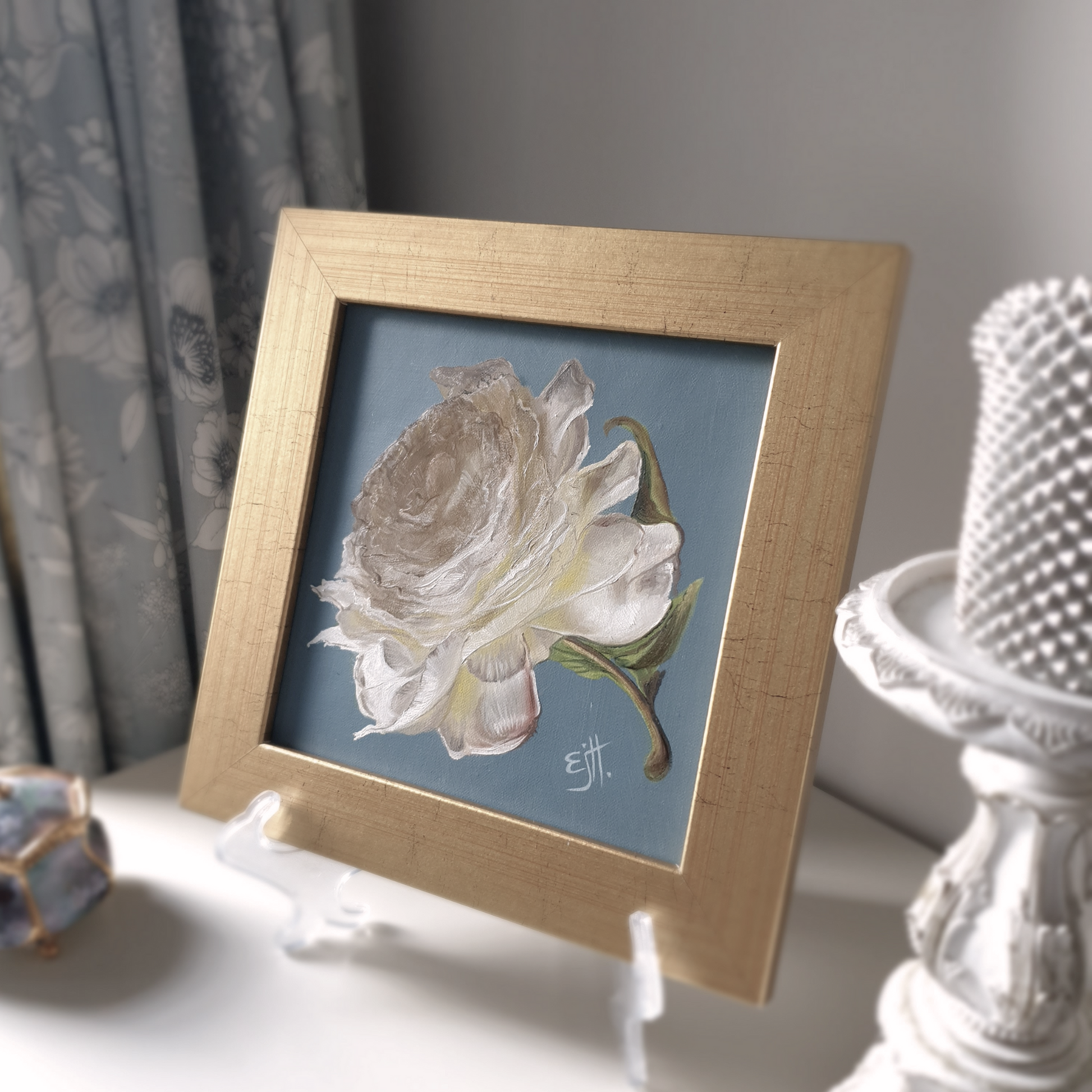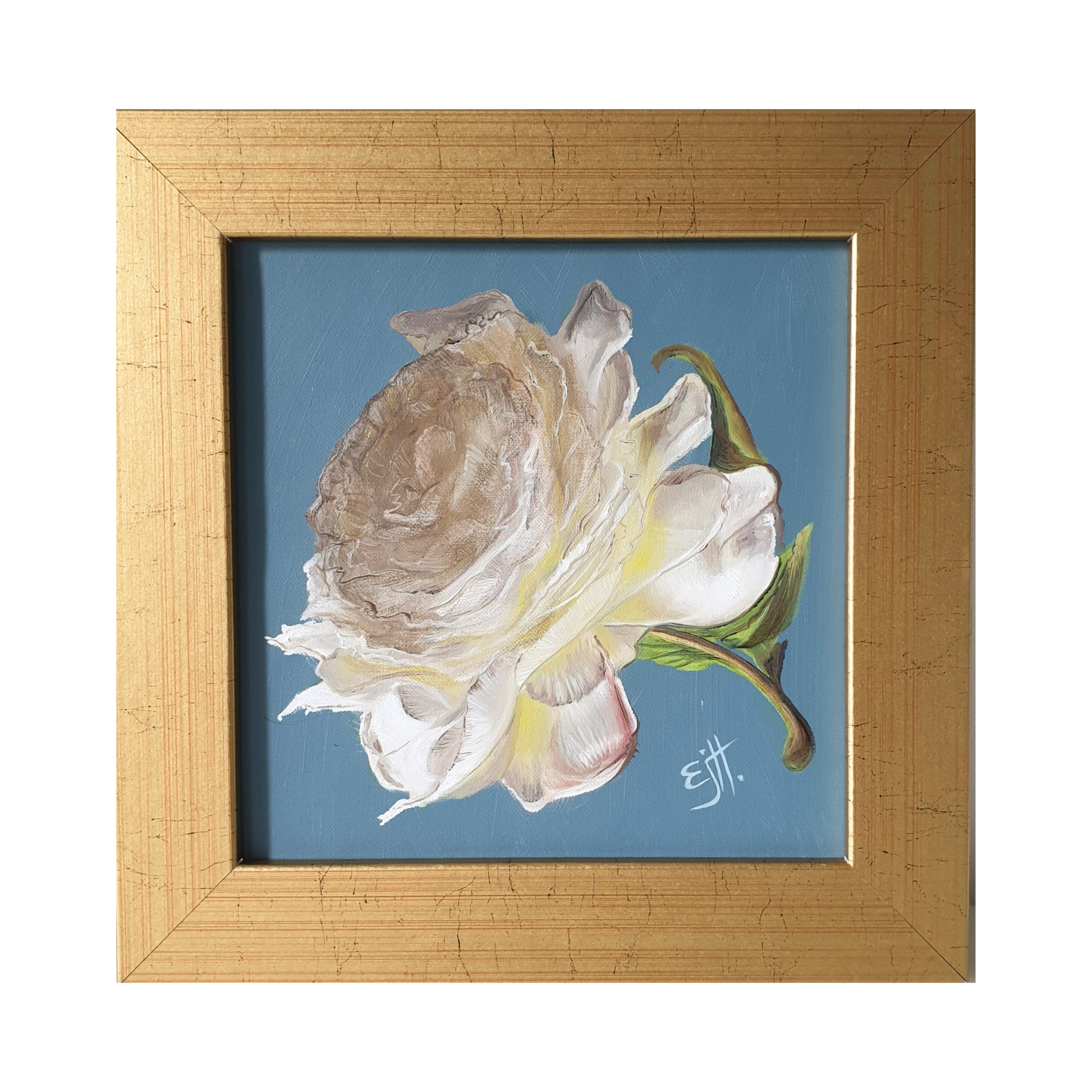 Original oil painting of a silvery cream floribunda on a powder blue background.