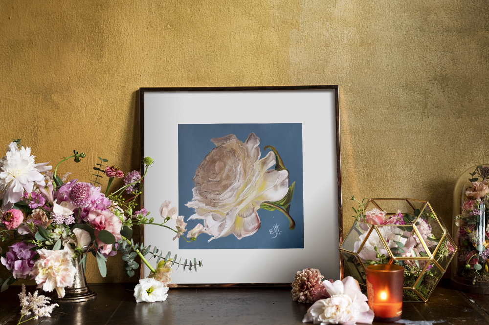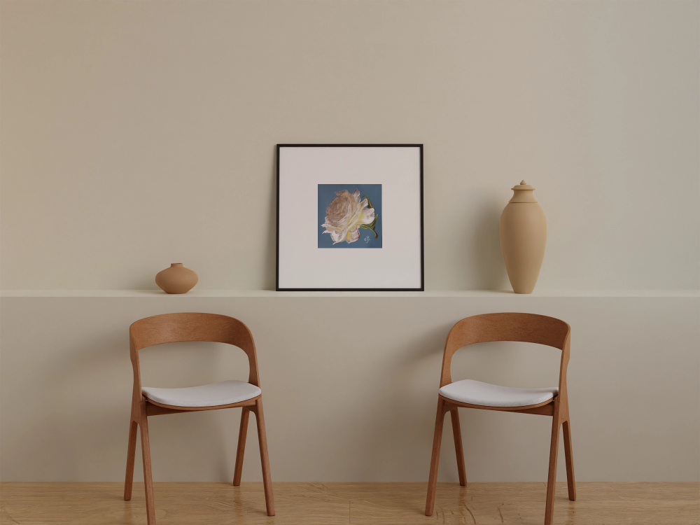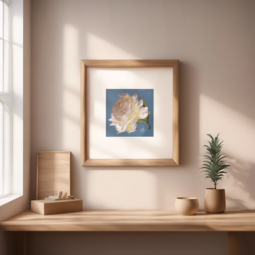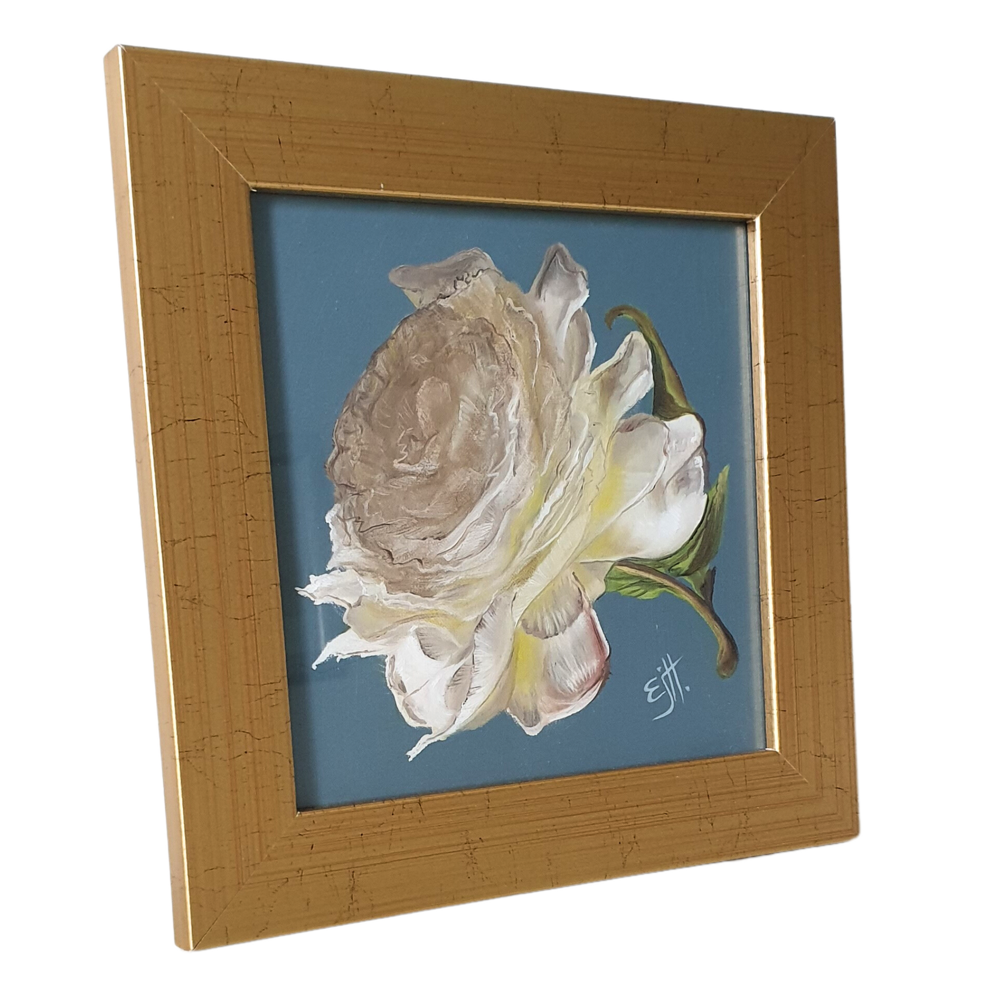 Original oil painting of a silvery cream floribunda on a powder blue background.