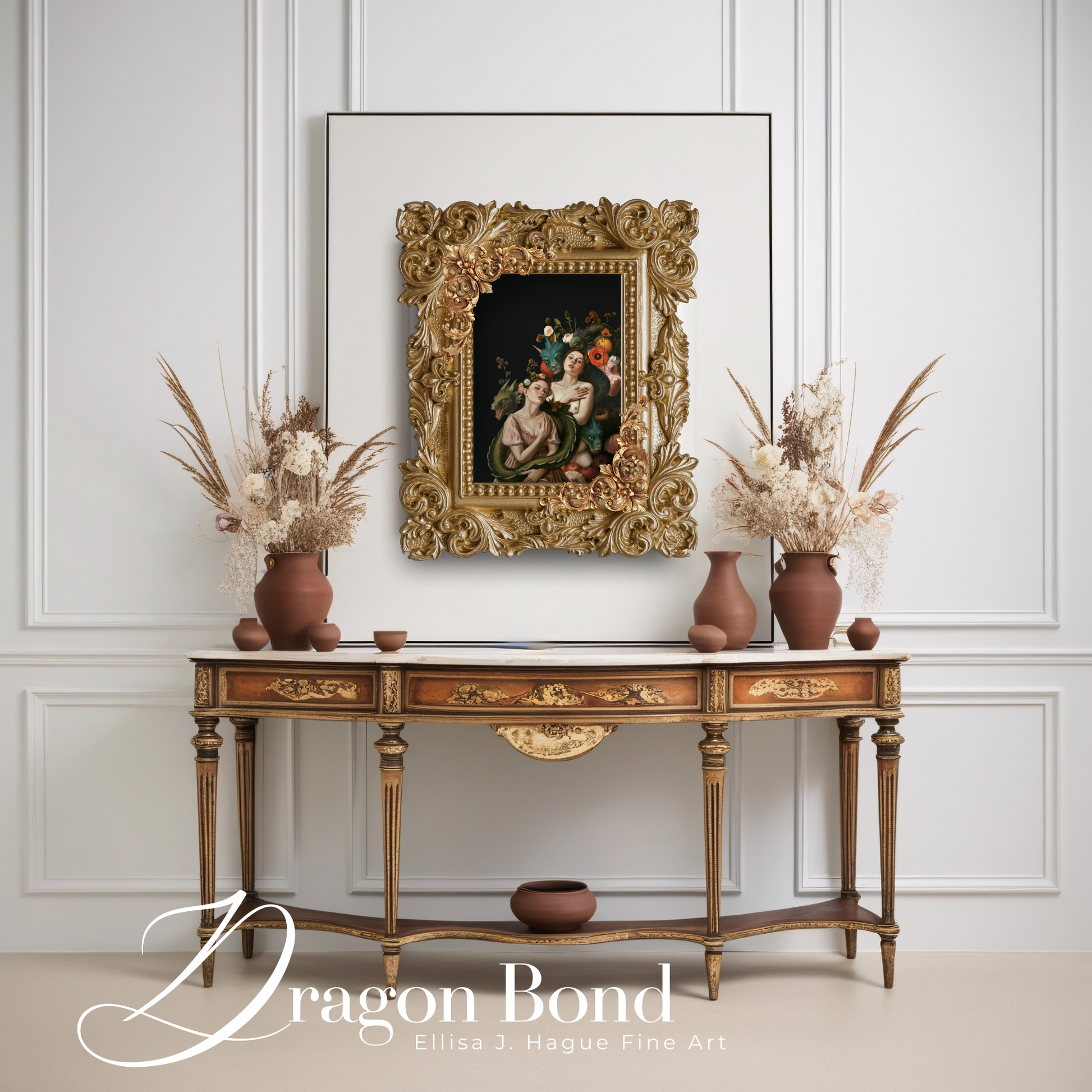 Step into an enchanted realm with Dragon Bond, a hand-painted oil portrait inspired by fairy tales and feminine mythology. Two women share a quiet moment with four vibrant dragons, surrounded by florals and fruit against a rich, near-black background. This fine art portrait piece blends classical technique with fantasy storytelling, ideal for collectors drawn to mythic symbolism, feminine archetypes, and heritage-inspired interiors.