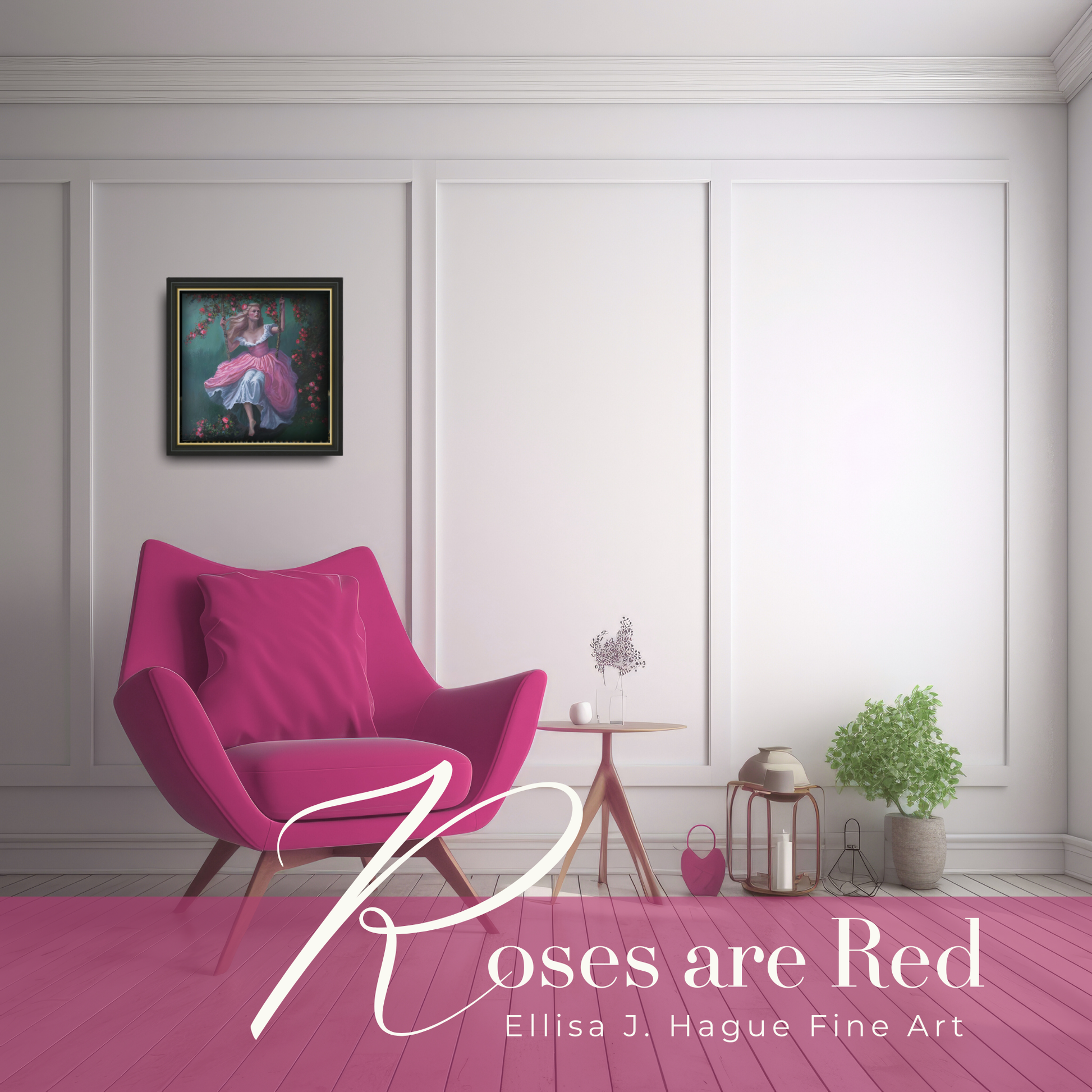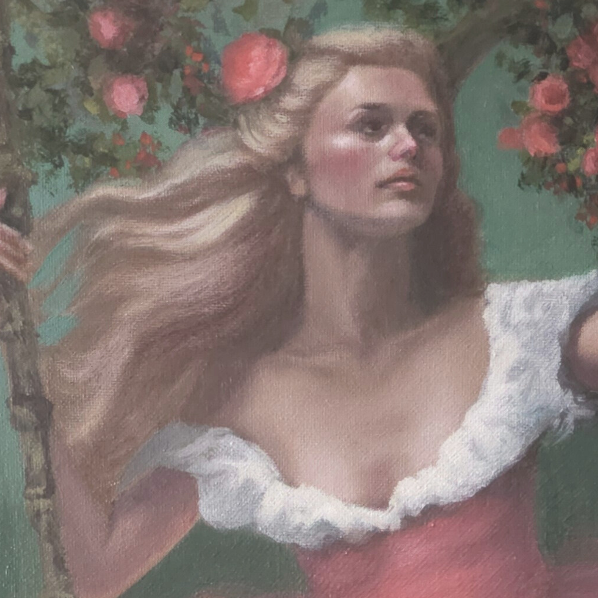 Roses Are Red has the gentle charm of an old Hollywood matinee. A young woman in vivid warm pink swings among romantic florals, captured in a calm, timeless moment. Painted with traditional layered techniques, it blends classic realism with a contemporary touch. Ideal for collectors who appreciate quiet, atmospheric figurative work with a nostalgic, cinematic feel.