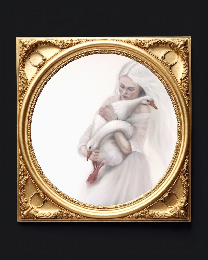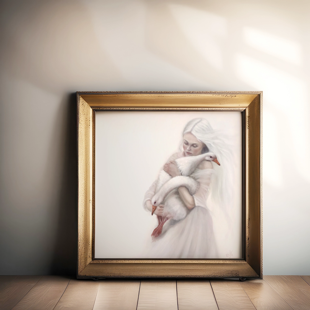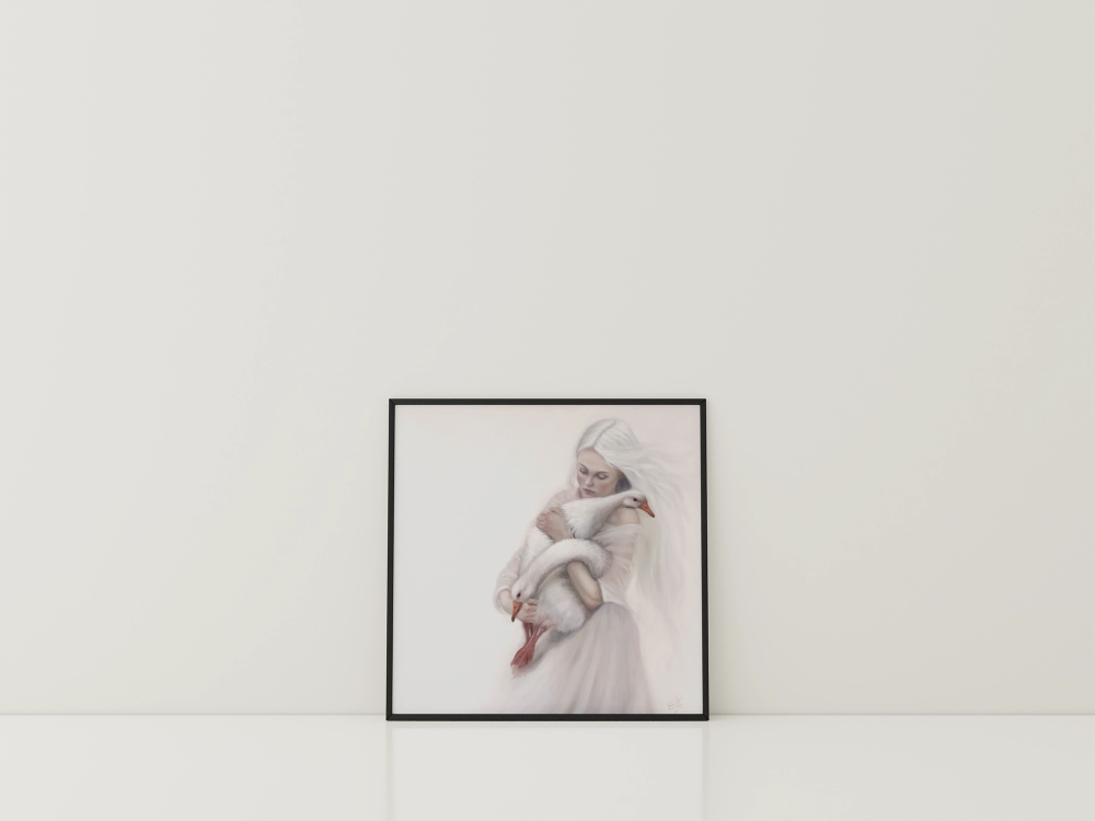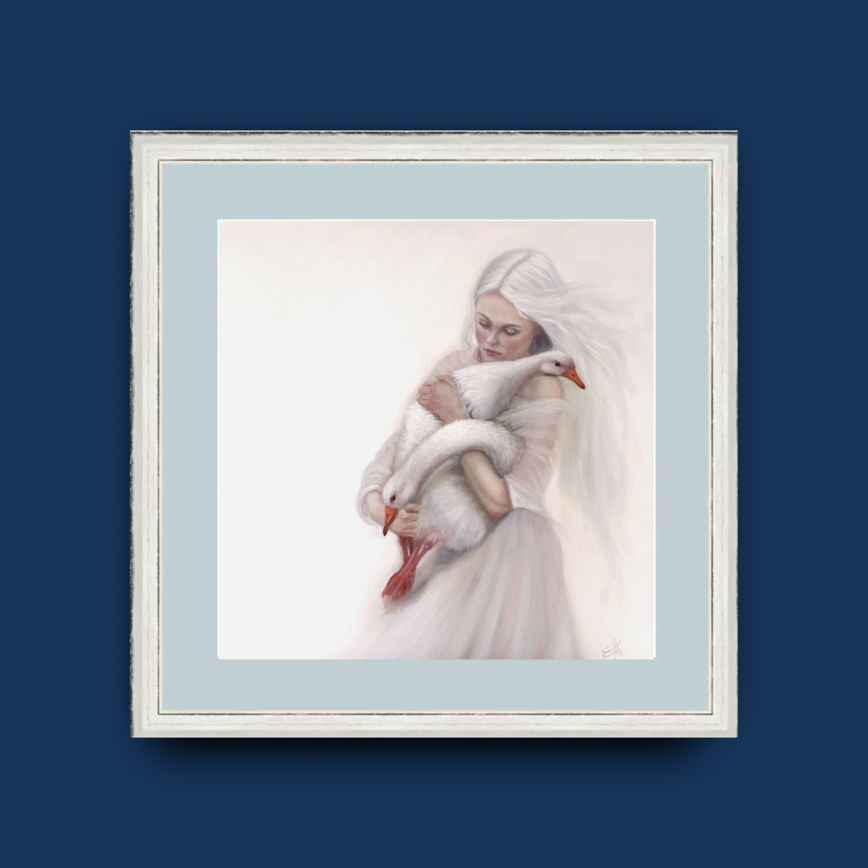 Sanctuary is a soft, muted white figurative oil painting featuring a pale, white‑haired girl gently holding two rescued geese. This tender, dreamlike artwork captures themes of care, innocence and quiet protection, painted in a serene, ethereal palette. A contemporary fairy‑tale piece perfect for collectors who love gentle storytelling, muted tones and emotionally resonant art.