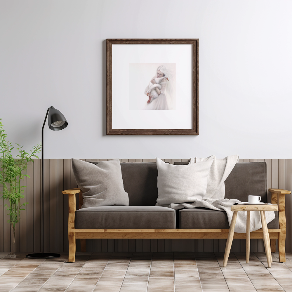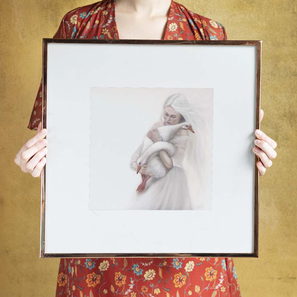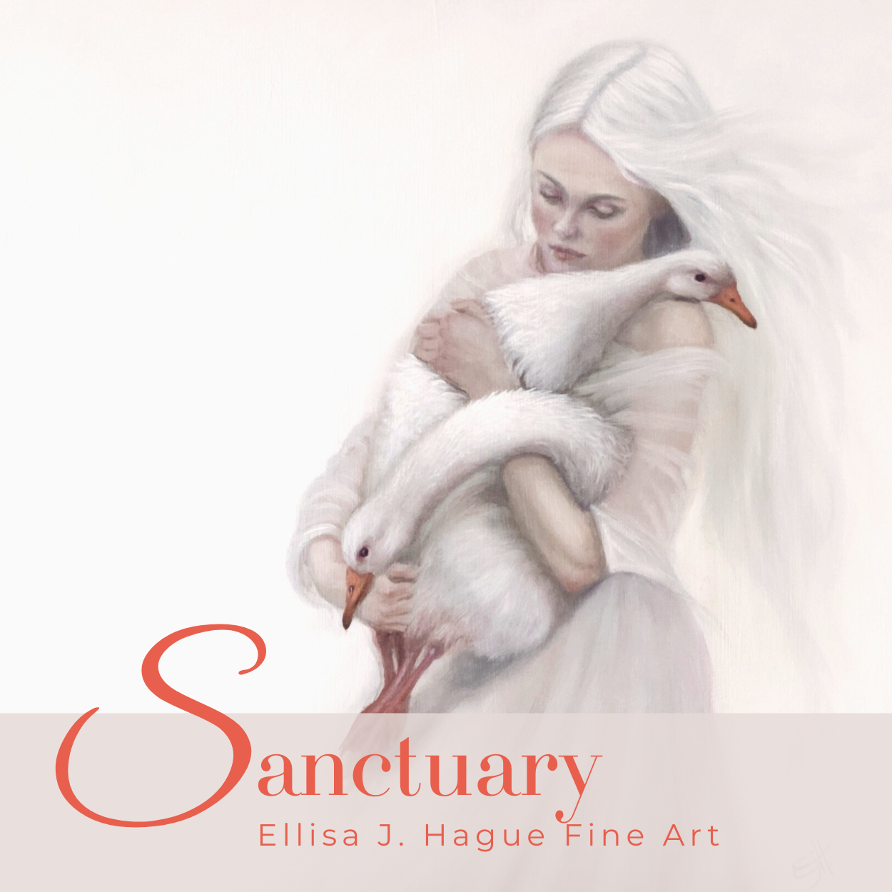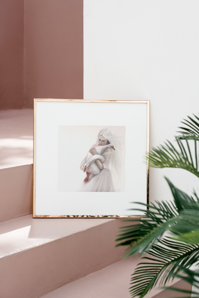 Sanctuary is a soft, muted white figurative oil painting featuring a pale, white‑haired girl gently holding two rescued geese. This tender, dreamlike artwork captures themes of care, innocence and quiet protection, painted in a serene, ethereal palette. A contemporary fairy‑tale piece perfect for collectors who love gentle storytelling, muted tones and emotionally resonant art.