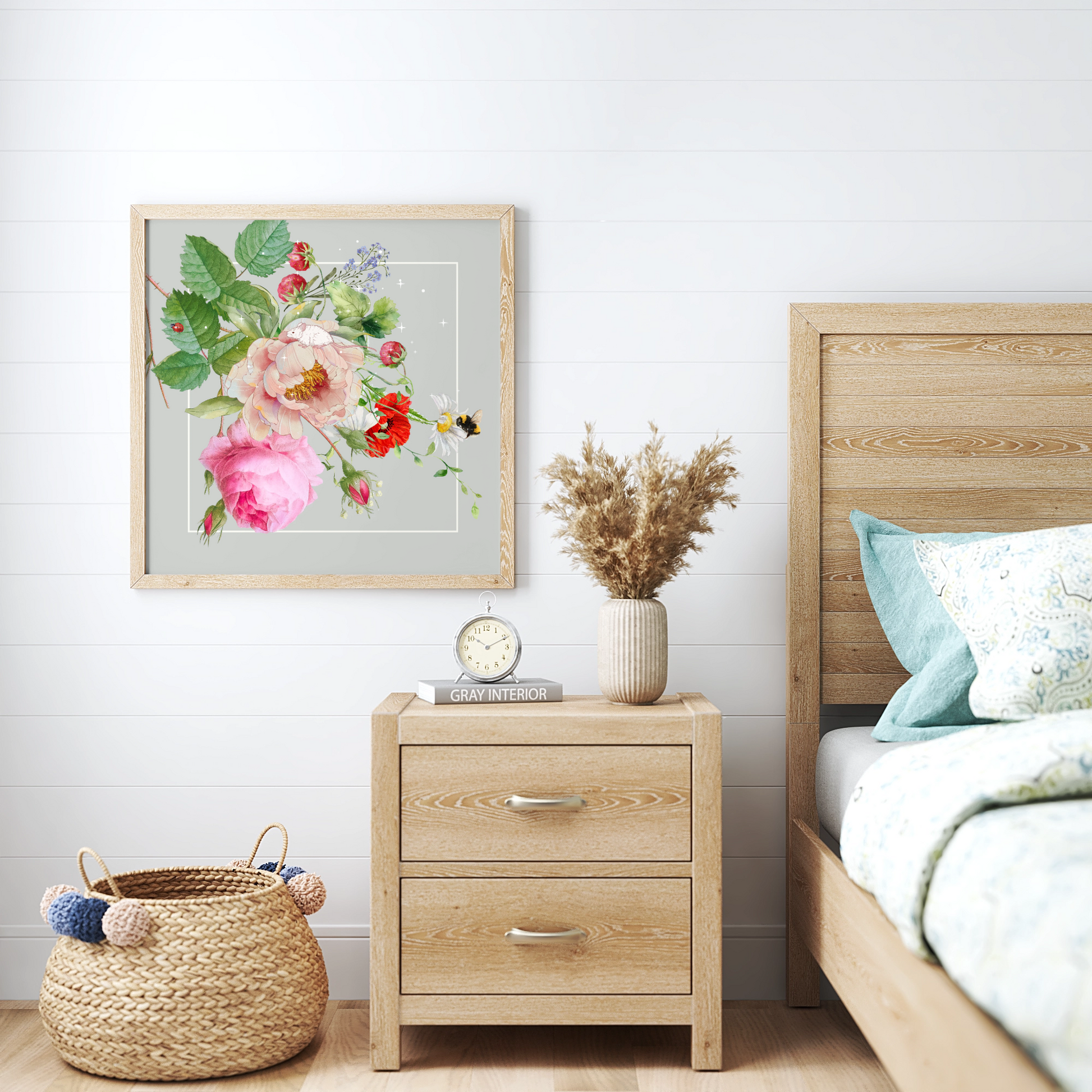 Neutral floral, mouse and bee theme fine art print.