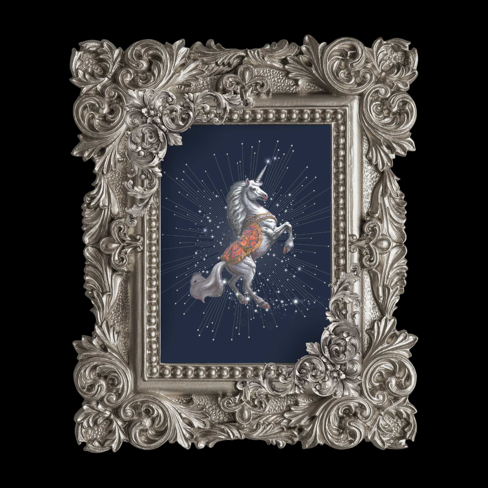 A striking unicorn art print in a contemporary heritage style, adapted from the original oil painting Thessalune. Digitally enhanced with a luminous starburst, this piece evokes a classical yet modern atmosphere, where traditional painting technique meets crisp digital clarity, and mythic symbolism is reimagined for today’s interiors.